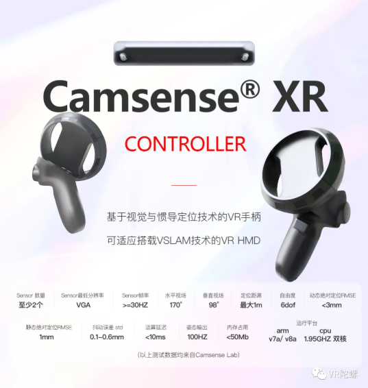 區(qū)別于以上所有定位方案,Camsense XR采用了視覺追蹤+慣性傳感方案,并且是極其少有的支持單目6DoF的追蹤方案。其主要應用于VR頭顯的手柄定位追蹤,結(jié)合頭部與手柄兩端實現(xiàn)精準定位,可適配不同的頭顯設備。