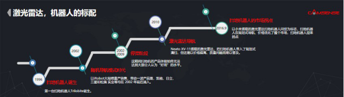機器人最開始出現(xiàn)在十幾年前,到2002年行業(yè)發(fā)展出現(xiàn)了停滯階段,主要是因為沒有實用技術(shù)的突破帶動用戶體驗上升,導致行業(yè)發(fā)展進程非常緩慢。2010年,美國的一家公司Neato率先把激光雷達嵌入到掃地機器人中,使這個行業(yè)出現(xiàn)了拐點。但由于當時激光雷達是第一次運用在掃地機器里,成本和價格都很高,因此售價非常高,消費群體就明顯被受限。